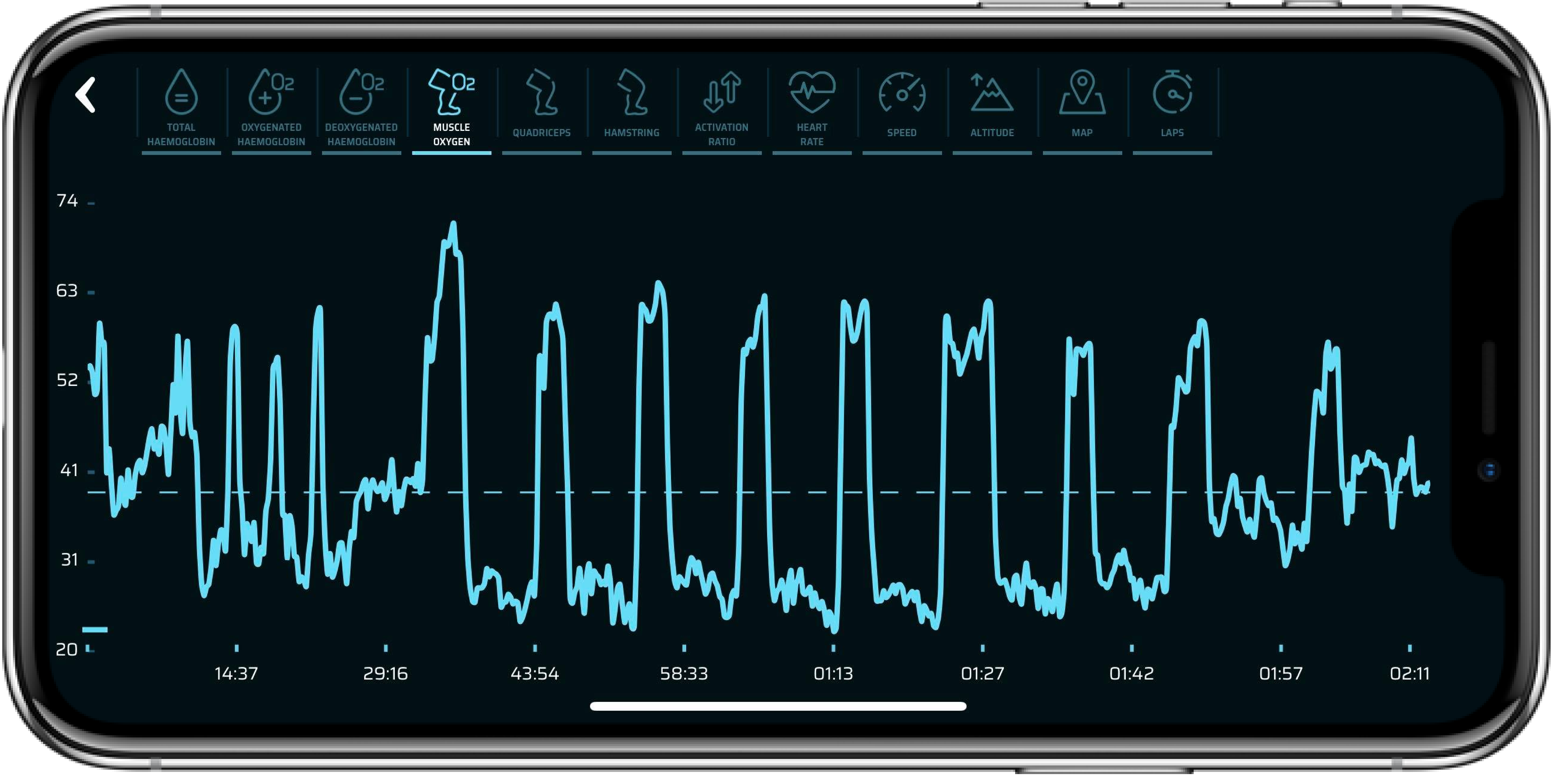 Instead, he should approach the intervals like this: instead of the workout saying, “1 min on, 1 min off”, it should be “work until the muscle oxygen is at 28% (bottom yellow line) and rest until it reaches 48%” (top yellow line).