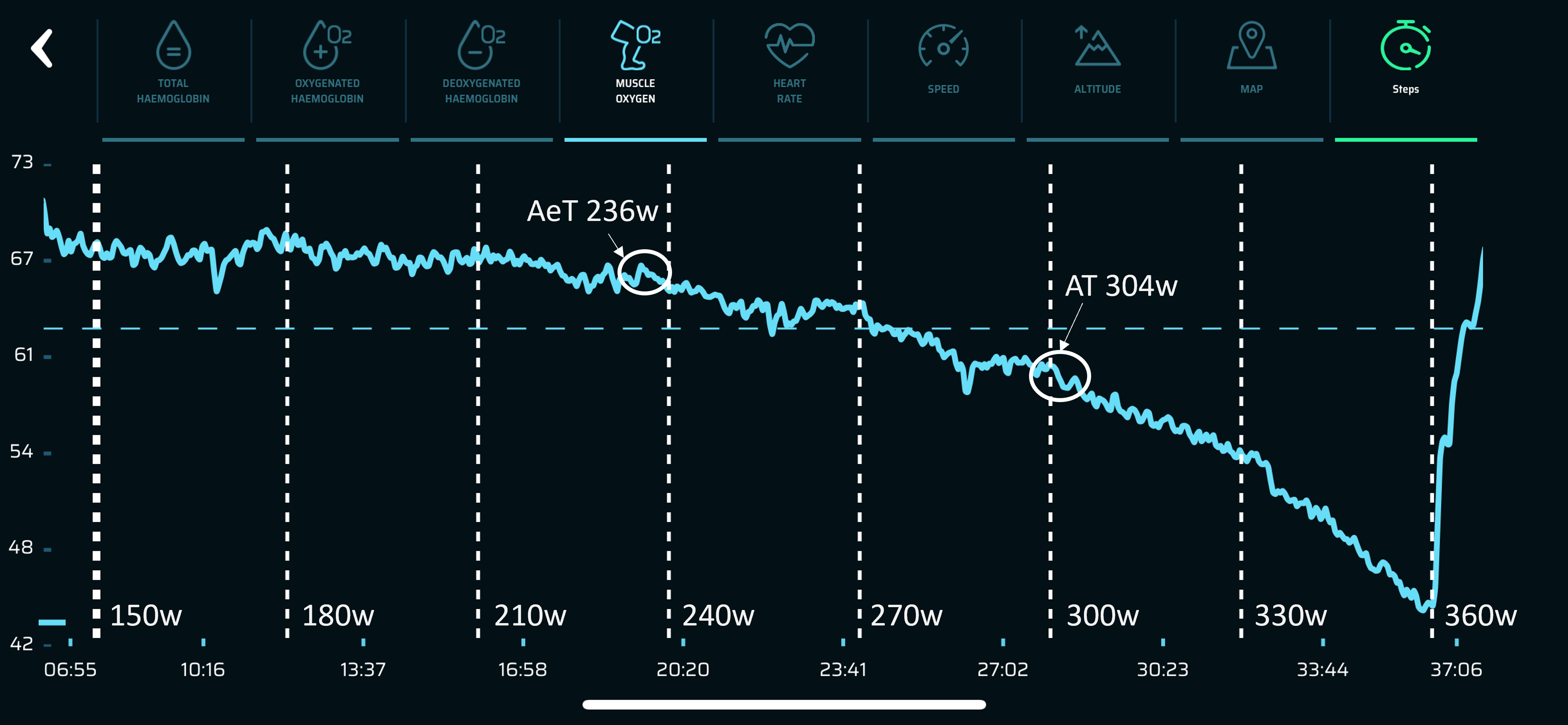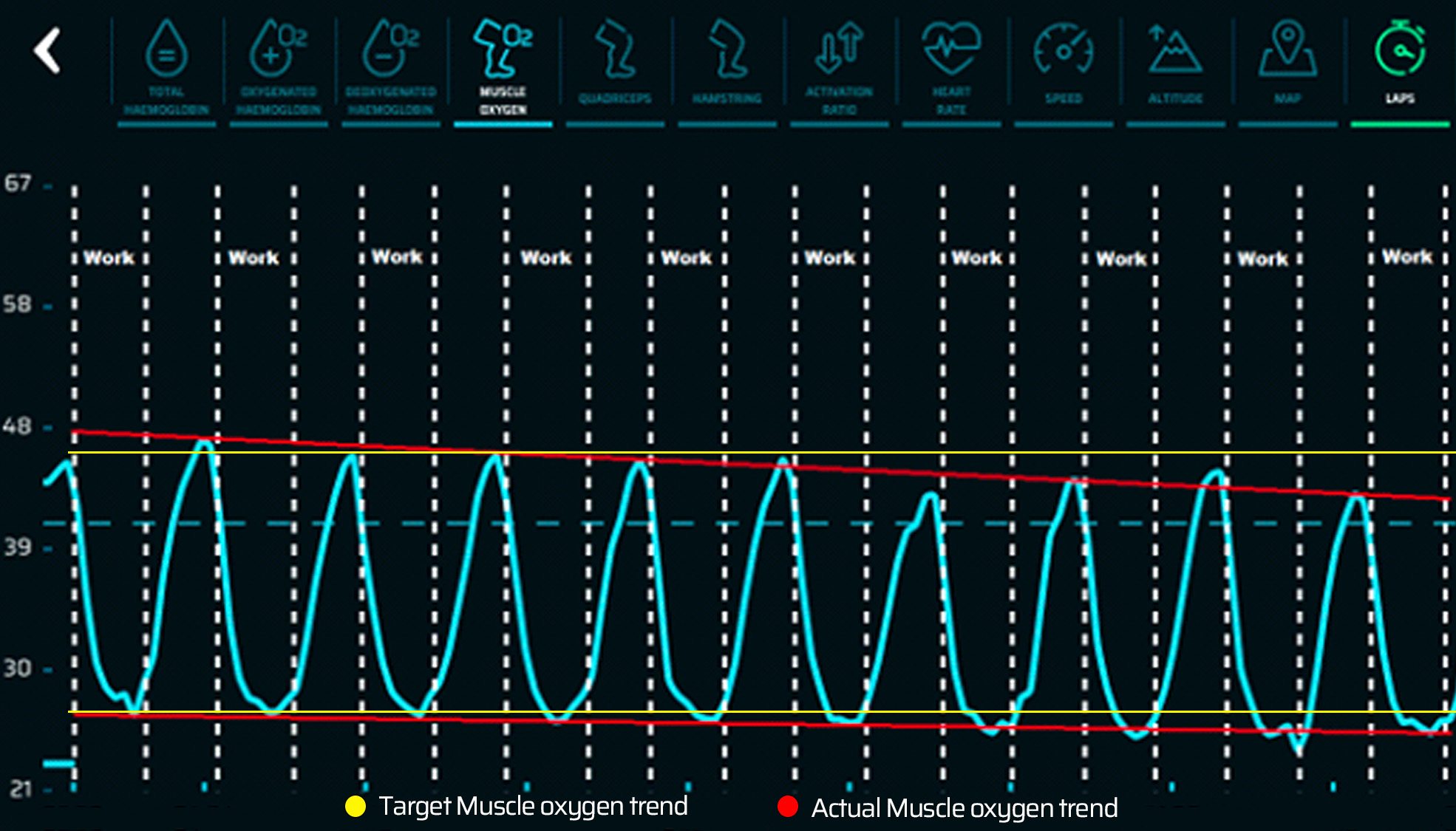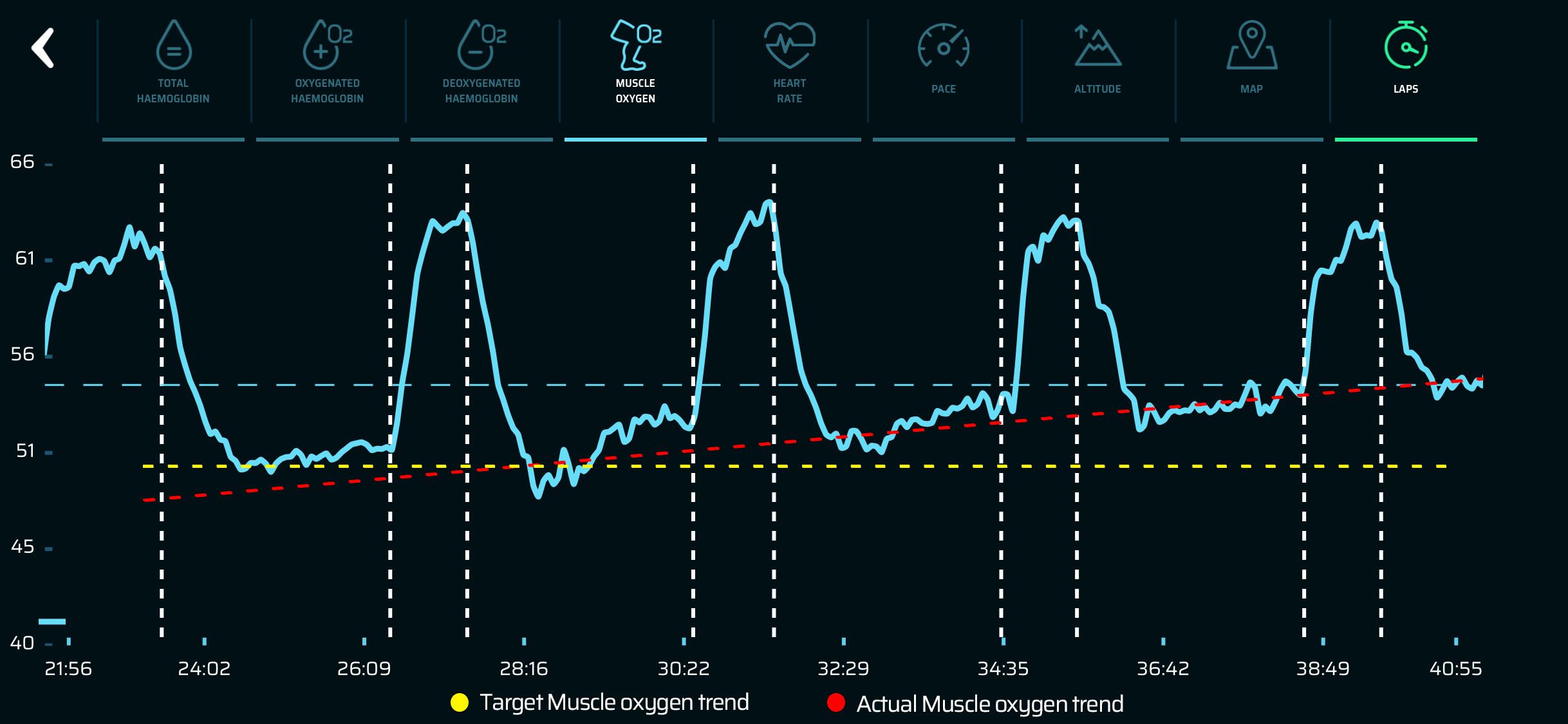 In this case the rider should have increased the power to make the average muscle oxygen reach around 51% each time (yellow line).