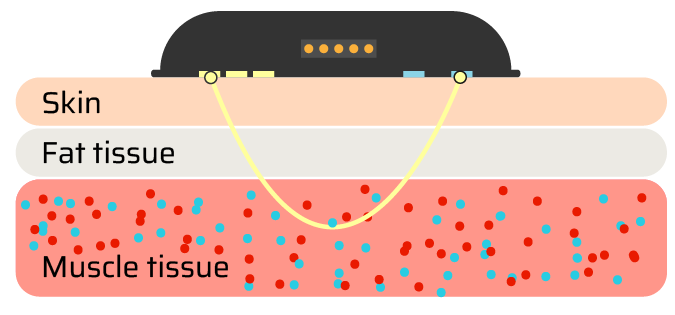 The light sources shine through your muscle and measures the intensity of the light returning to the sensor.
