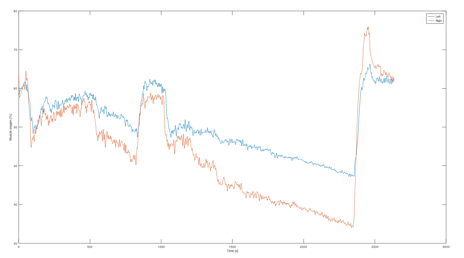 After the workout I could figure out, that my Muscle Oxygen was lower because my oxygenated haemoglobin was lower, by using the GRASPOR app. This means that I expose my body to more stress than I should if I sustain 410 watts, something that is natural after an 8-week break, where I have lost a lot of muscular strength.